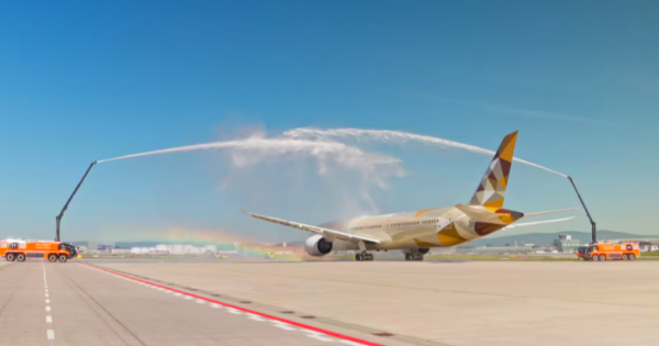 Before boarding, Captain Majed joined Fraport Chief Technology Officer Dr. Pierre Dominique Prümm for a ribbon-cutting at the gate. The morning also held a surprise for one couple from Limburg, heading to Singapore for their holiday. Captain Majed greeted them at the gate with an upgrade to Business for the flight to Abu Dhabi.